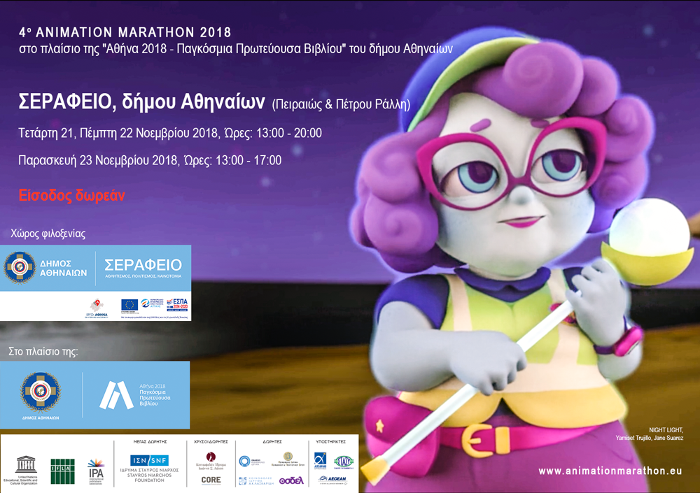 Το 4ο ANIMATION MARATHON, ένα νεαρό και ανήσυχο διεθνές φεστιβάλ ταινιών κινούμενων σχεδίων μικρού μήκους με διαγωνιστικό χαρακτήρα, υλοποιείται φέτος στο πλαίσιο των δράσεων της «ΑΘΗΝΑ 2018 – Παγκόσμια Πρωτεύουσα Βιβλίου» του δήμου Αθηναίων, μέγας δωρητής της οποίας είναι το Ίδρυμα Σταύρος Νιάρχος. Οι εκδηλώσεις διαρκούν από την Τετάρτη 21 έως και το Σάββατο 24 Νοεμβρίου 2018, με πρωινές προβολές για σχολεία και απογευματινές προβολές για το ευρύ κοινό. Όλες οι εκδηλώσεις είναι με δωρεάν είσοδο.