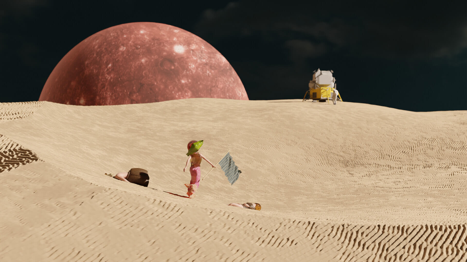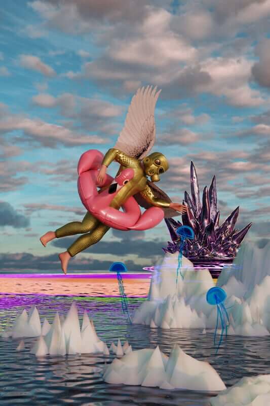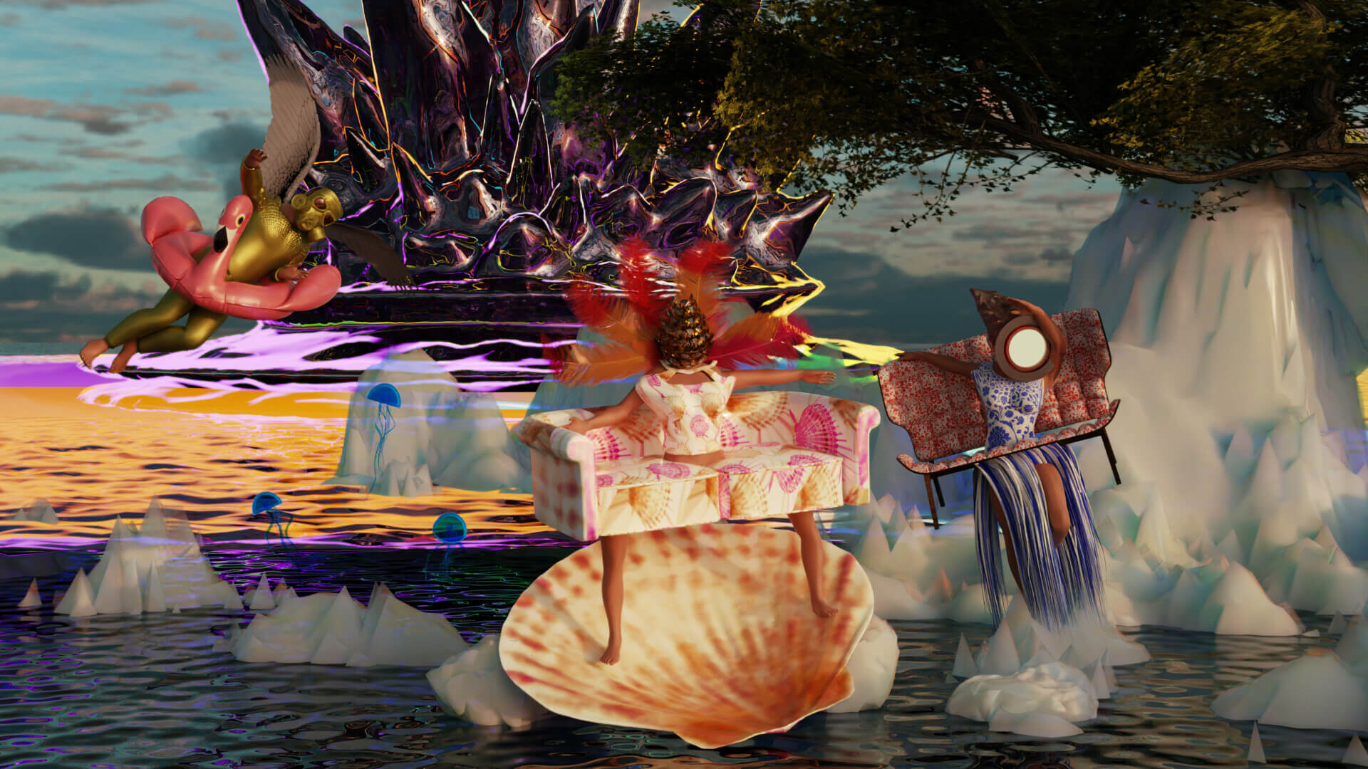 2025Deepworld Serenade is a 3D animation with an AI-generated soundtrack, set in an underwater sanctuary built by humans after an asteroid wiped out the surface world. Within this refuge, glass-headed hybrid figures gather in surreal landscapes, lounging as catastrophe unfolds nearby. The work reflects on apathy in the face of disaster, where distraction and spectacle replace urgency and care.