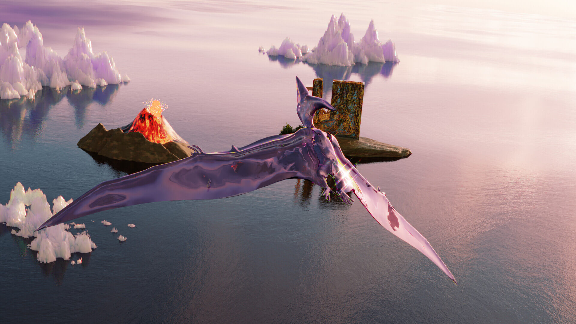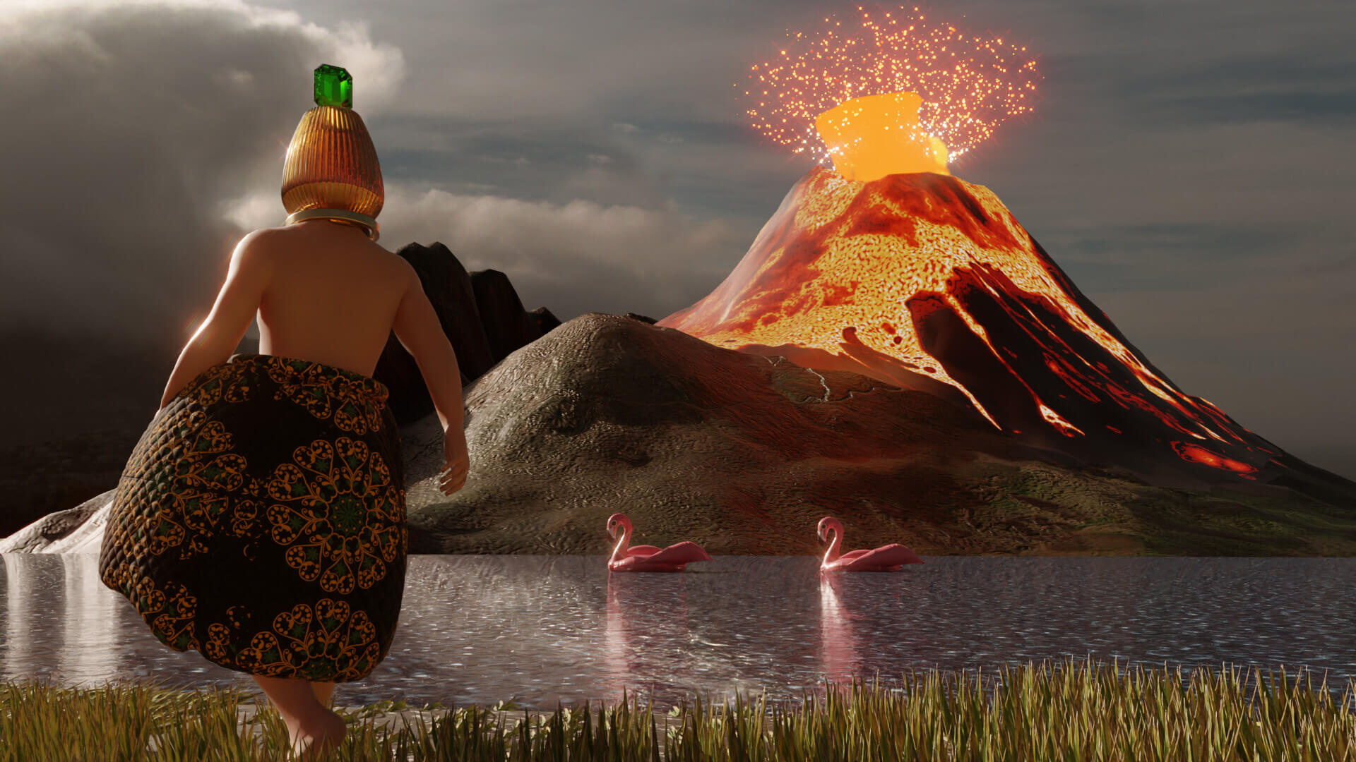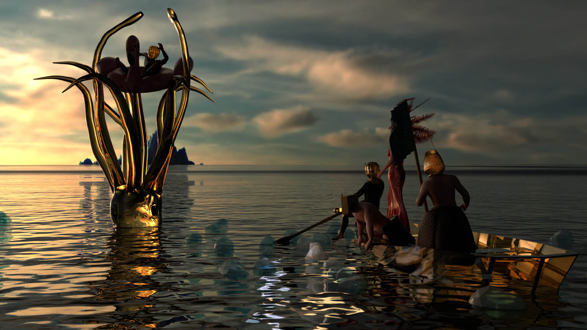 2025Deepworld Serenade is a 3D animation with an AI-generated soundtrack, set in an underwater sanctuary built by humans after an asteroid wiped out the surface world. Within this refuge, glass-headed hybrid figures gather in surreal landscapes, lounging as catastrophe unfolds nearby. The work reflects on apathy in the face of disaster, where distraction and spectacle replace urgency and care.
